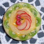洋ナシのババロアを、色とりどりのフルーツで飾ったケーキ。
